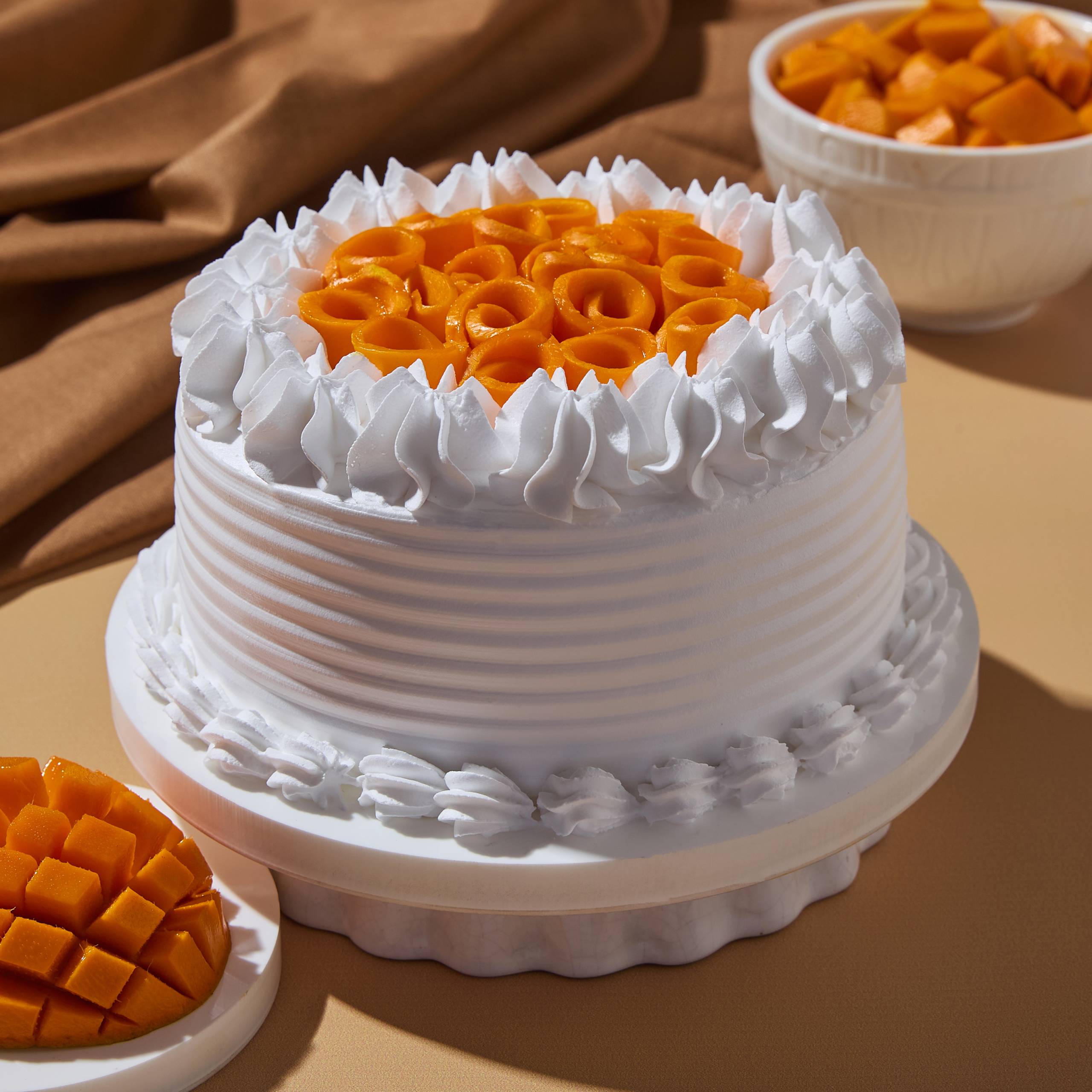 Light, airy layers of vanilla sponge, enveloped in silky mango whipped cream and generously loaded with fresh-cut Alphonso mangoes. Finished with a smooth, pillowy coat of whipping cream for the perfect mango indulgence.