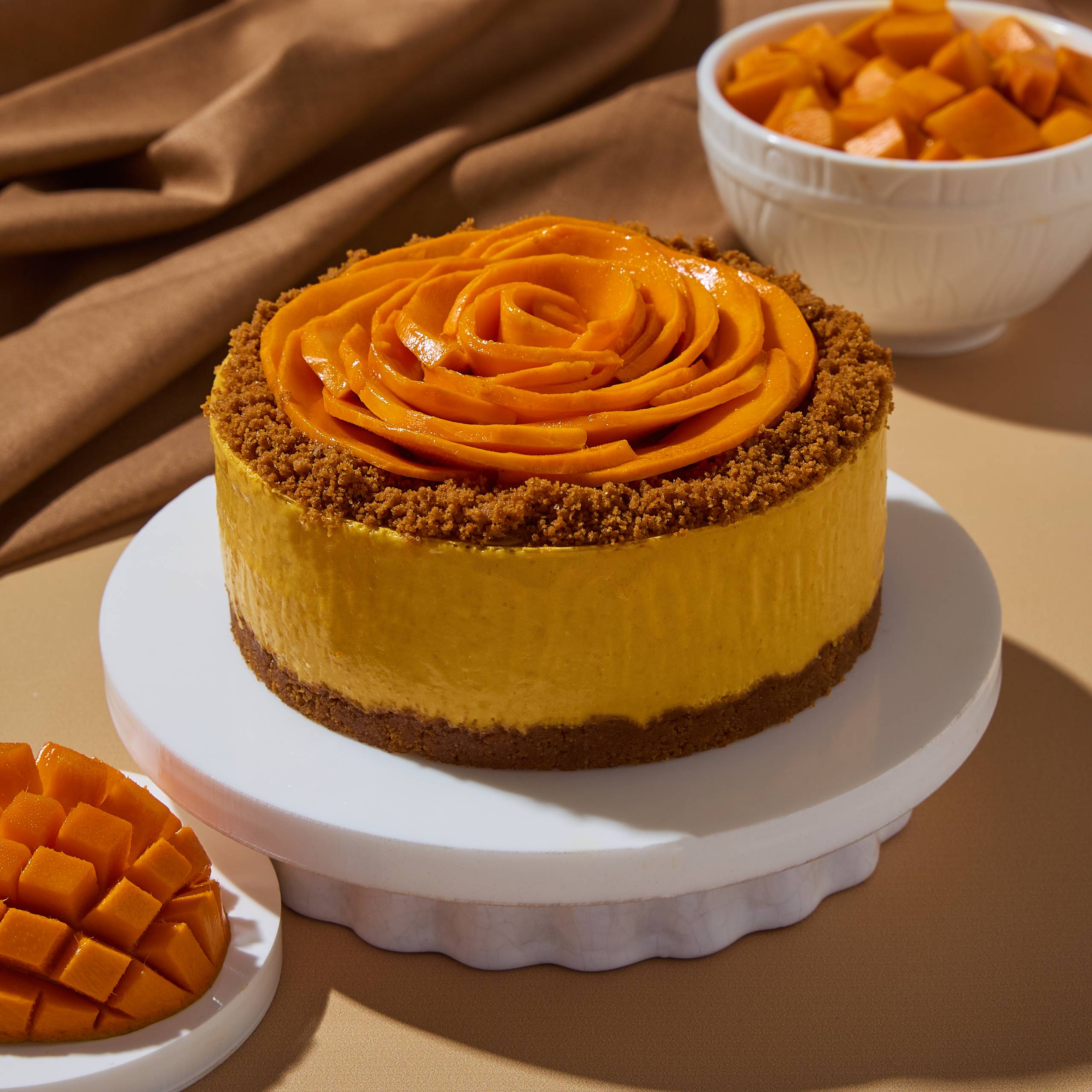 A mango-infused cheesecake resting on a buttery Biscoff biscuit base, offering the perfect balance of creaminess and crunch. Topped with caramelized Biscoff biscuit crumbs and fresh mango slices.