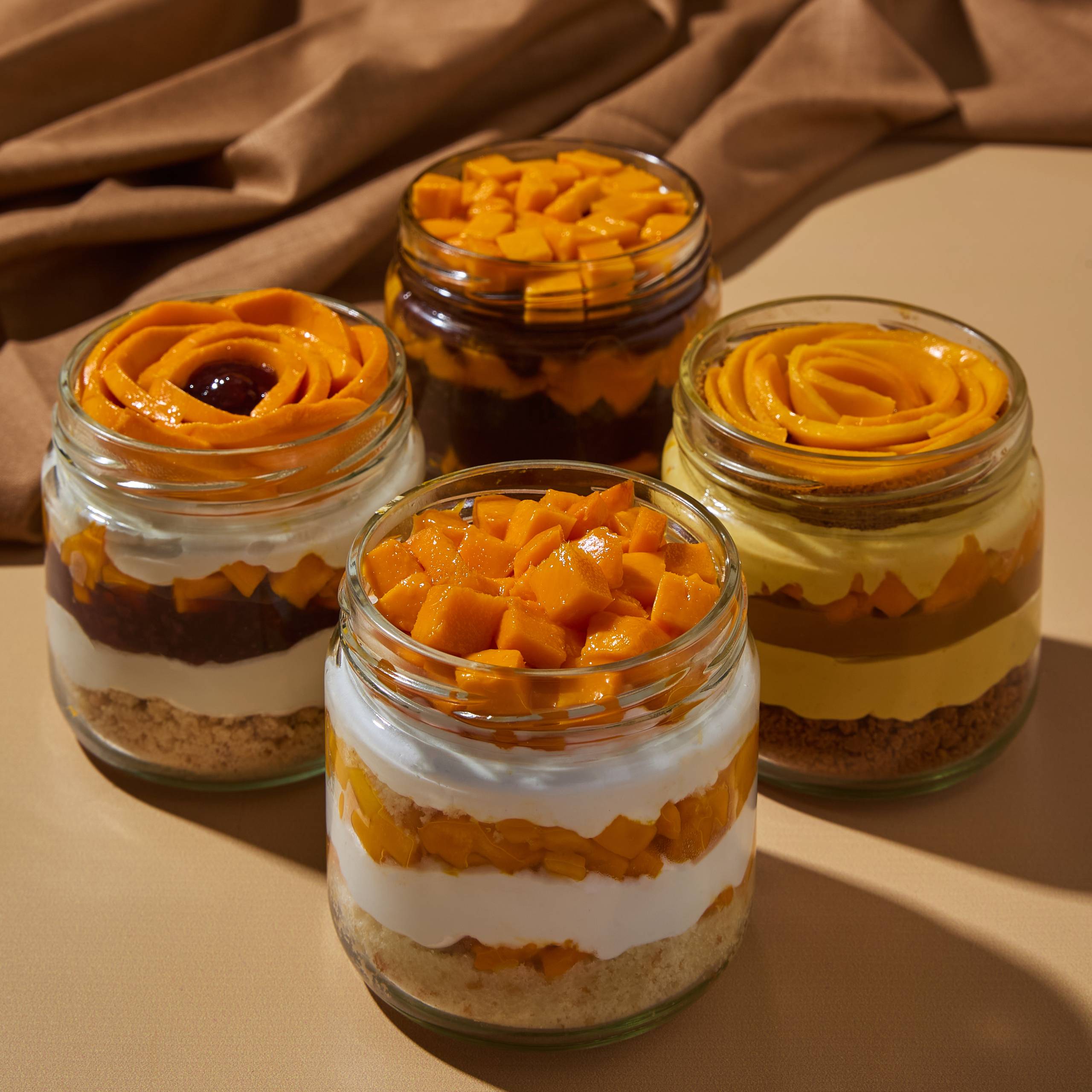 Dessert Jars – a delightful symphony of layered mango cakes, each spoonful a cascade of flavors, meticulously crafted and presented in charming jars. Perfect for savoring the moment or on-the-go sweetness.